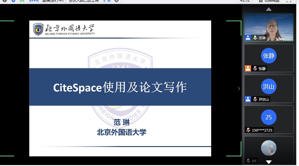 7月7日下午,北京外国语大学博士生导师范琳教授应邀为广大师生做了题为《Citespace使用及论文写作》的线上学术讲座。讲座由太阳集团tcy8722网站院长尹洪山教授主持,太阳集团tcy8722网站部分教师和研究生在线聆听了讲座。此外,讲座还吸引了山东大学、中国海洋大学、北京外国语大学、南京农业大学、山东科技大学、曲阜师范大学等高校的1300多名师生参与。
